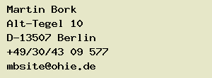 Die durch mir erstellten Inhalte und Angebote auf diesen Seiten unterliegen dem deutschen Urheberrecht. Eine Vervielfältigung oder Verwendung dieser Inhalte und Angebote in anderen elektronischen oder gedruckten Publikationen ist ohne ausdrückliche Zustimmung des Autors nicht gestattet. Downloads und Kopien dieser Seite sind nur für den privaten, nicht kommerziellen Gebrauch gestattet. Soweit die Inhalte auf diesem Internetangebot nicht von mir erstellt wurden, werden die Urheberrechte Dritter beachtet. Insbesondere werden Inhalte Dritter als solche gekennzeichnet. Sollten Sie trotzdem auf eine Urheberrechtsverletzung aufmerksam werden, bitte ich um einen entsprechenden Hinweis. Bei Bekanntwerden von Rechtsverletzungen werden ich derartige Inhalte umgehend entfernen.